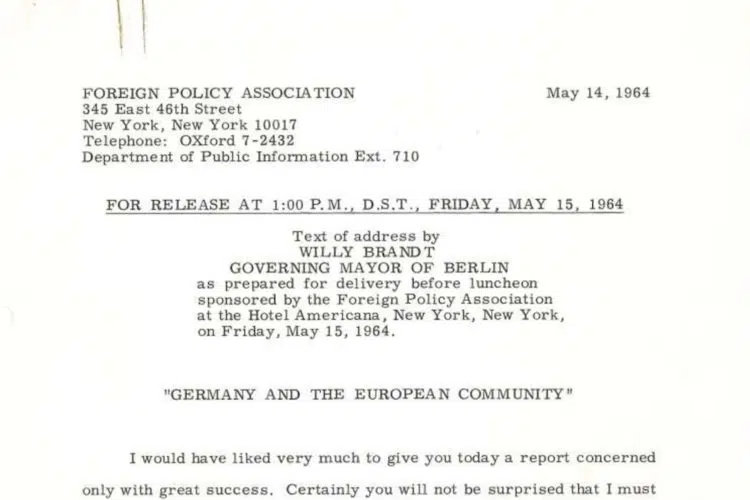 In his speech at the Foreign Policy Association in New York on 15 May 1964, Willy Brandt underlines both the successes and the challenges of European integration. The Governing Mayor of Berlin and SPD chairman also points out the importance of the transatlantic partnership and further demands a more proactive role of West Germany and Western Europe in developing better relations with Eastern Europe.